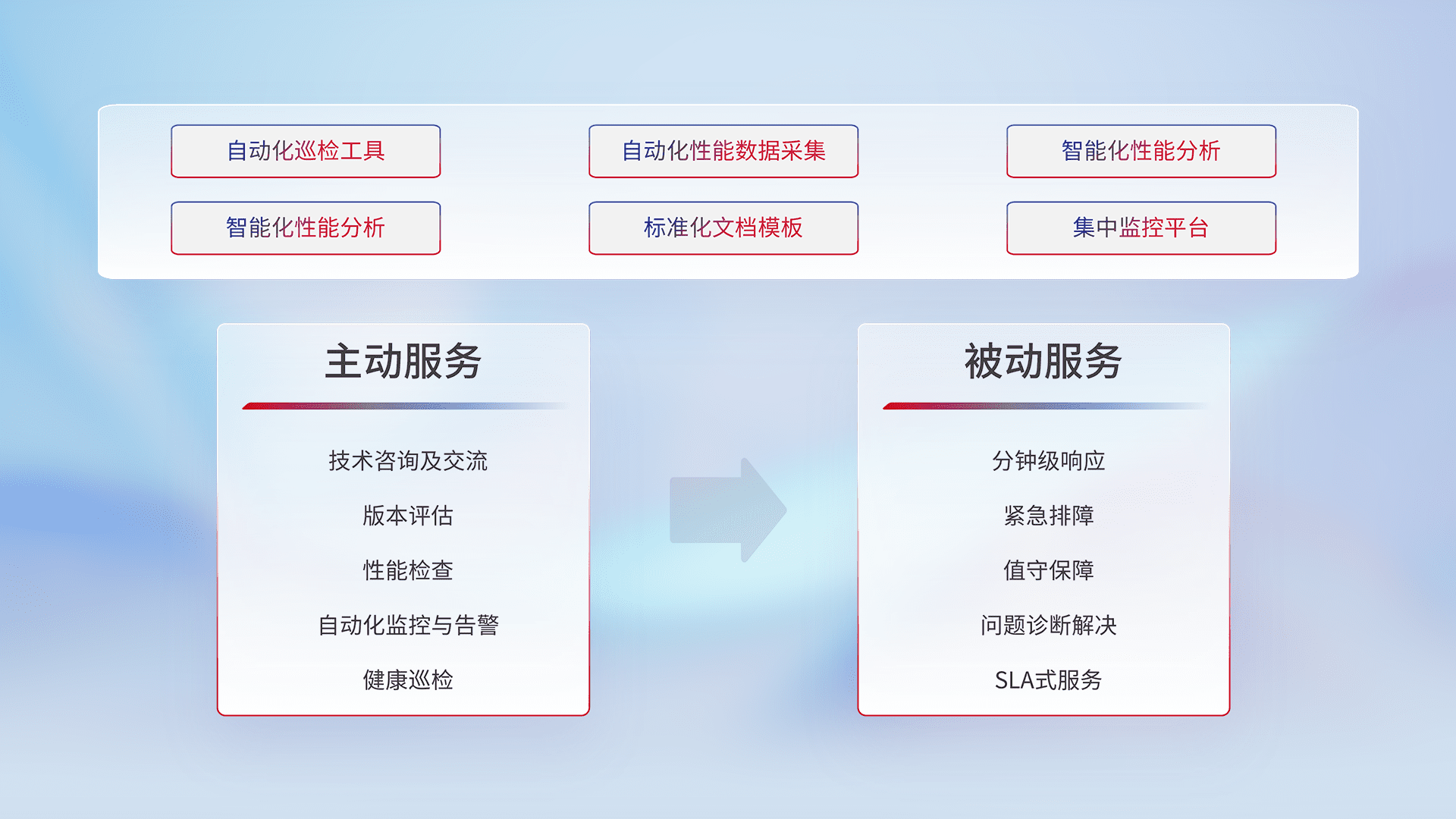 智能化工具和标准化文档,,,保障服务质量,,,提供主动服务(包含技术咨询、、版本评估、、性能检查、、自动化监控与告警、、、、健康巡检)和被动服务包含(分钟级响应、、、紧急排障、、、、值守保障、、问题诊断解决、、、SLA服务)。。