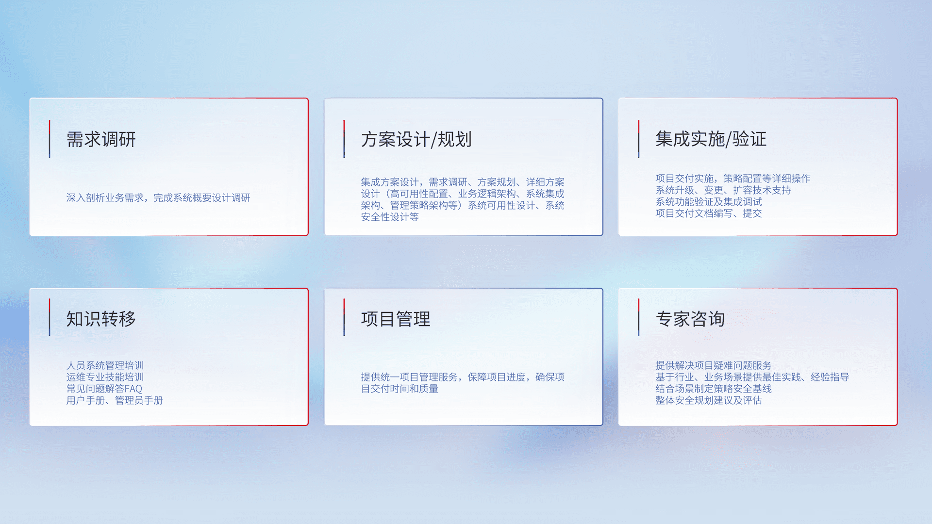 针对客户行业特性,,,将宏观的安全战略和需求,,通过专业的交付服务,,,,实现项目落地,,,为客户提供标准规范的集成交付服务。。。